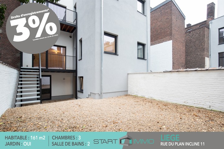 START-IMMO a le plaisir de vous présenter ce magnifique duplex de 161m² dans la toute nouvelle résidence "Plan Incliné" sis rue du plan incliné 11/13 à Liège. Un appartement unique en son genre mêlant élégance, confort et espace extérieur privatif en plein cœur de Liège. Situé au premier étage, ce duplex inversé se distingue par son agencement moderne et fonctionnel. Il se compose (au premier étage), d'une grande chambre, une salle de bain (douche), WC indépendant, espace buanderie, cuisine ouverte sur un grand salon/salle à manger qui se prolonge vers l’extérieur grâce à une agréable terrasse et un jardin privatif offrant un cadre rare en milieu urbain. Le niveau inférieur, situé au rez-de-chaussée, comprend deux chambres confortables, une salle de bain élégante et une buanderie pratique, le tout assurant un accès direct à la partie extérieur. Ce bien séduit par son caractère atypique, son calme, et son confort contemporain, le tout dans un environnement privilégié à deux pas de la gare des Guillemins, des commerces et du centre-ville. Un appartement idéal pour ceux qui recherchent un logement spacieux, lumineux et fonctionnel, combinant les avantages d’une maison et la praticité d’un appartement. Pour plus d’informations ou organiser une visite, contactez START-IMMO dès aujourd’hui via le 0479 28 96 67 - 0475 20 13 90 ou via info@start-immo.be