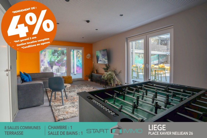 Kots de haut standing totalement neuf à vendre dans une toute nouvelle résidence étudiante (Chick & Kot CARRE) ! Situé en plein cœur de liège, au pied de la place Xavier Neujean, accès direct au centre piétonnier, à deux pas de la place Saint-Lambert, proche des petits commerces et grandes surfaces ainsi que tous les espaces culturels et de loisirs. Equipements et services : - Coin cuisine full équipé - Salle de bain privative - Accès sécurisé via badge d'accès - Meublé (lit, placards, bureau, rideaux) - Salle d'étude - Salle de détente / salon (tv) – Patio central - Buanderie (machine à laver et séchoir). Gestionnaire sur place. PEB : A ! Les kots sont loués 635 €/mois + charges (internet, chauffage, eau, électricité, service nettoyage des communs, mise à disposition de la buanderie et des espaces communs...) de 125€. Vous désirez venir visiter ou avoir des infos supplémentaires ?  N'attendez plus et contactez START-IMMO au 04/287.12.90 - 0479.28.96.67 ou au 0475/20/13/90 ou via l'adresse info@start-immo.be. Informations et photos données à titre indicatif et non contractuelles.