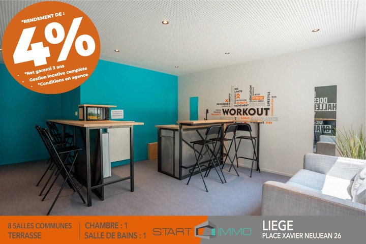 Kots de haut standing totalement neuf à vendre dans une toute nouvelle résidence étudiante (Chick & Kot CARRE) ! Situé en plein cœur de liège, au pied de la place Xavier Neujean, accès direct au centre piétonnier, à deux pas de la place Saint-Lambert, proche des petits commerces et grandes surfaces ainsi que tous les espaces culturels et de loisirs. Equipements et services : - Coin cuisine full équipé - Salle de bain privative - Accès sécurisé via badge d'accès - Meublé (lit, placards, bureau, rideaux) - Salle d'étude - Salle de détente / salon (tv) – Patio central - Buanderie (machine à laver et séchoir). Gestionnaire sur place. PEB : A ! Les kots sont loués 635 €/mois + charges (internet, chauffage, eau, électricité, service nettoyage des communs, mise à disposition de la buanderie et des espaces communs...) de 125€. Vous désirez venir visiter ou avoir des infos supplémentaires ?  N'attendez plus et contactez START-IMMO au 04/287.12.90 - 0479.28.96.67 ou au 0475/20/13/90 ou via l'adresse info@start-immo.be. Informations et photos données à titre indicatif et non contractuelles.