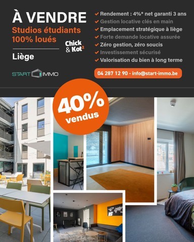 Kots de haut standing totalement neuf à vendre dans une toute nouvelle résidence étudiante (Chick & Kot CARRE) ! Situé en plein cœur de liège, au pied de la place Xavier Neujean, accès direct au centre piétonnier, à deux pas de la place Saint-Lambert, proche des petits commerces et grandes surfaces ainsi que tous les espaces culturels et de loisirs. Equipements et services : - Coin cuisine full équipé - Salle de bain privative - Accès sécurisé via badge d'accès - Meublé (lit, placards, bureau, rideaux) - Salle d'étude - Salle de détente / salon (tv) – Patio central - Buanderie (machine à laver et séchoir). Gestionnaire sur place. PEB : A ! Les kots sont loués 635 €/mois + charges (internet, chauffage, eau, électricité, service nettoyage des communs, mise à disposition de la buanderie et des espaces communs...) de 125€. Vous désirez venir visiter ou avoir des infos supplémentaires ?  N'attendez plus et contactez START-IMMO au 04/287.12.90 - 0479.28.96.67 ou au 0475/20/13/90 ou via l'adresse info@start-immo.be. Informations et photos données à titre indicatif et non contractuelles.